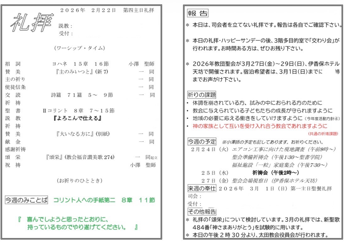 神様のためにはたらくことは、義務ではなく、よろこびが出発点で無ければならない。いつもよろこんでとはいうもののよろこべないときもあるそれは、宿仰の主語が自分にあると目に見える成果がないときや実行することに困難さを感じるときには、よろこびをもてない。よろこびが自分の感情の起伏によるものなら、状況によって揺れ動くのは当然である。喜怒哀楽の喜であるなら、気分によって安定しない心許ないものとなる。