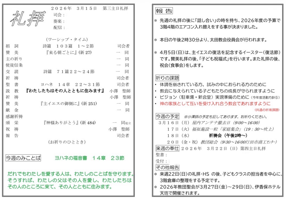 23節には、イエス様の言葉を守る者を父なる神様が愛され、『わたしたちはその人のところに来て、その人とともに住みます』との約束があるのです。